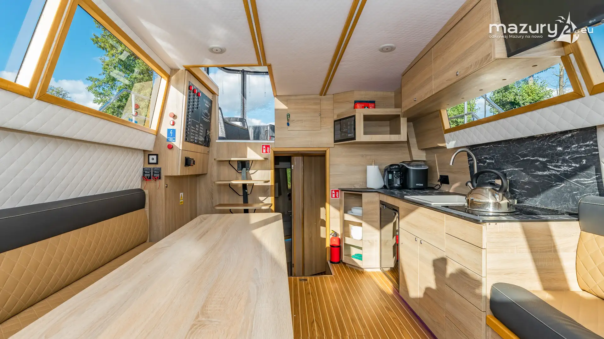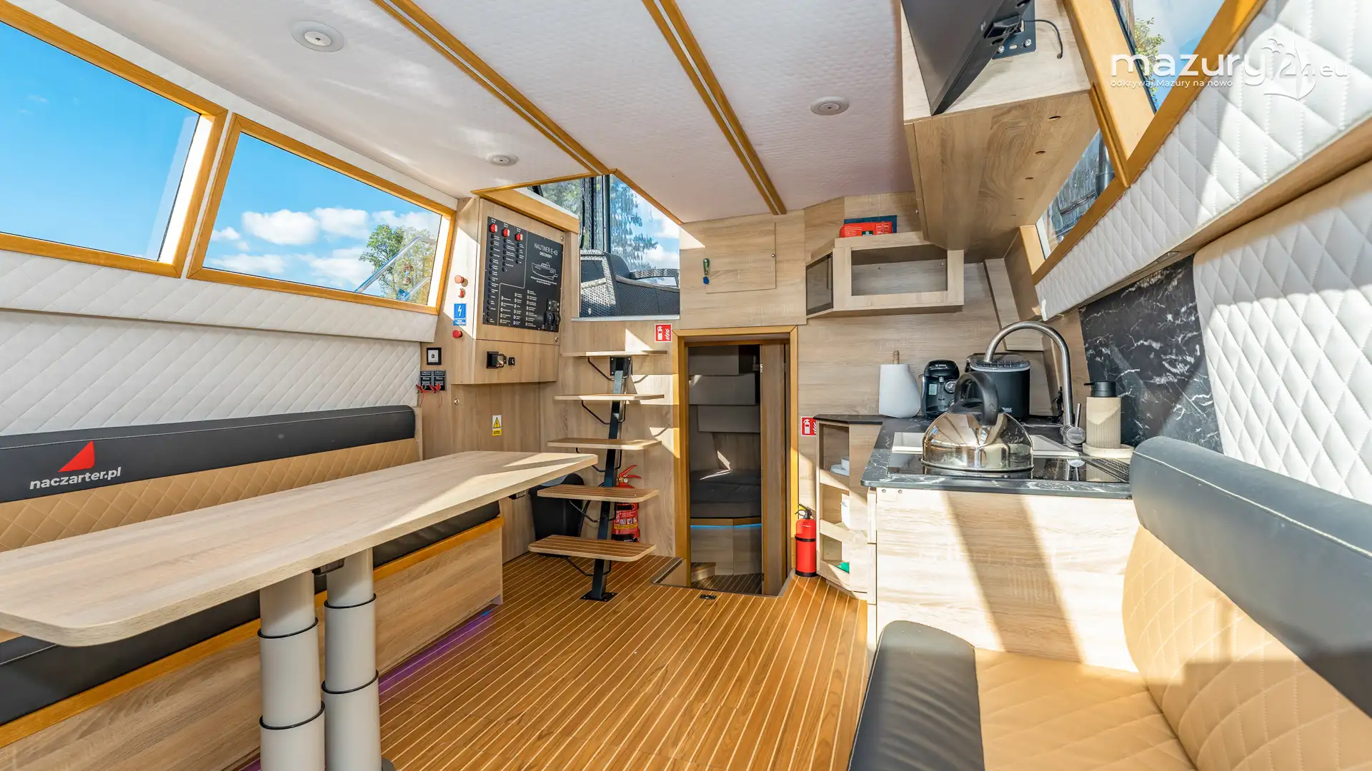 W zależności od konfiguracji jednostka oferuje dwie lub trzy zamykane kabiny dwuosobowe, przestronną mesę z aneksem kuchennym oraz jedną lub dwie łazienki z pełnowymiarowym węzłem sanitarnym. Duże przeszklenia poprawiają doświetlenie wnętrza i wzmacniają wrażenie otwartej przestrzeni. Górny pokład (flybridge) stanowi dodatkową strefę wypoczynku i punkt widokowy, który w warunkach mazurskich czy śródlądowych znacząco podnosi atrakcyjność jednostki.