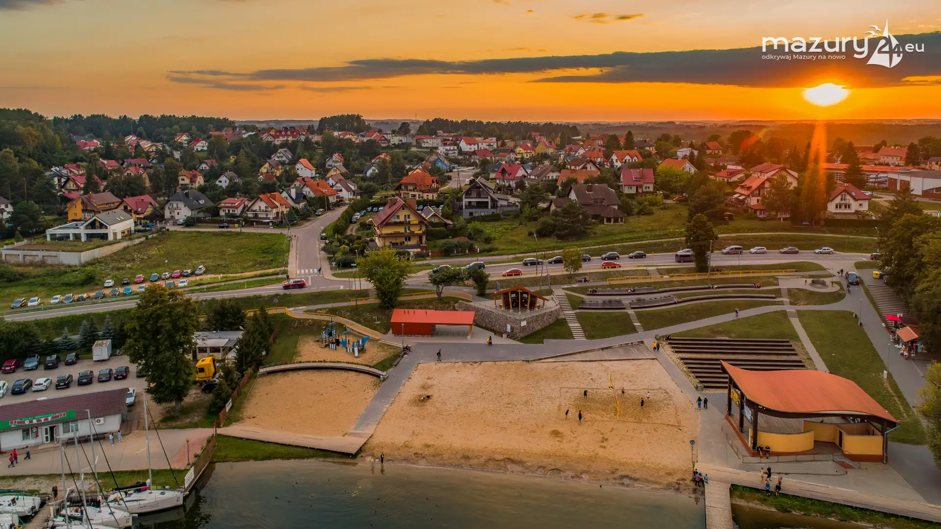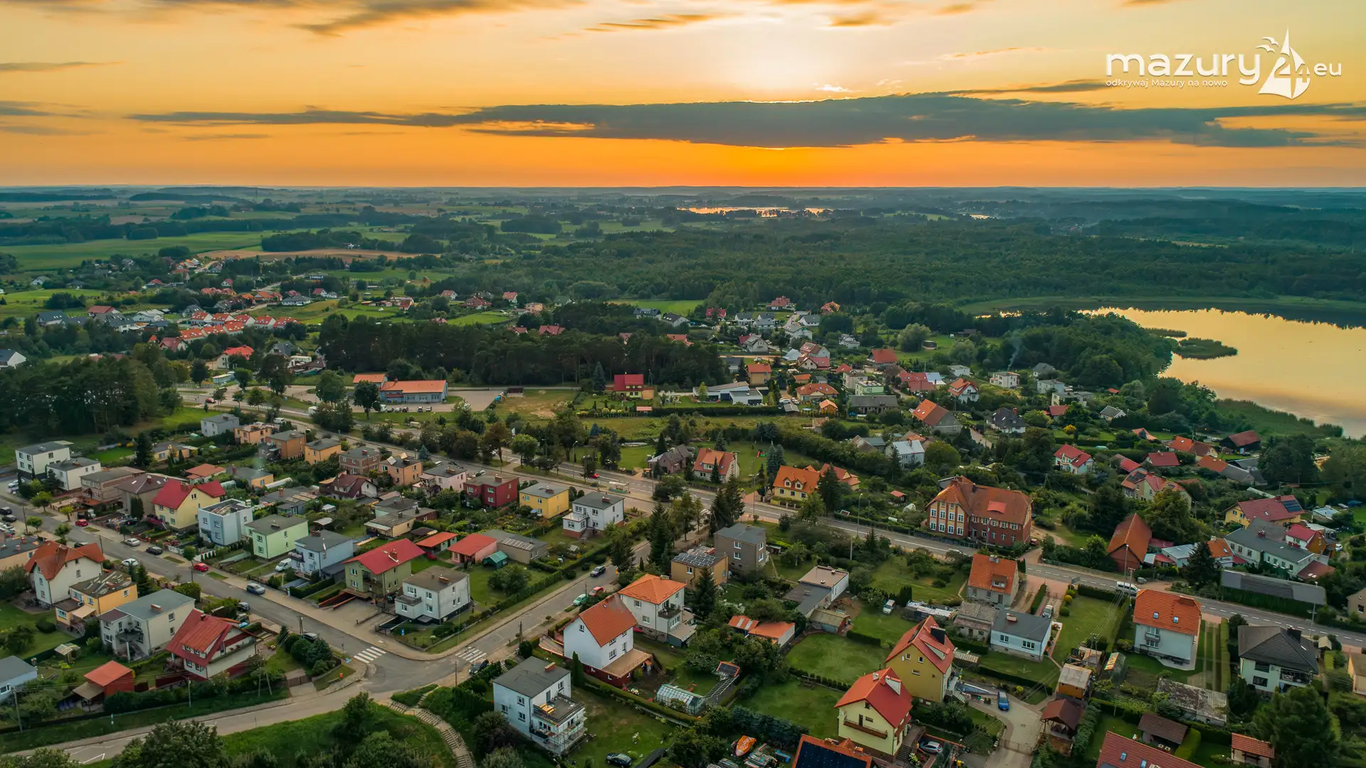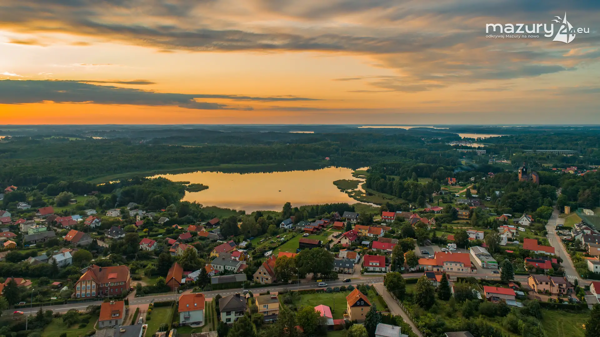 Mikołajki po zachodzie słońca z drona, sierpień 2025 r.